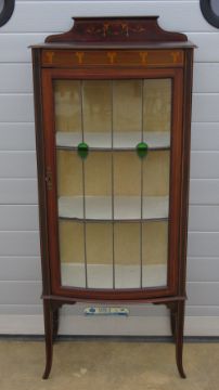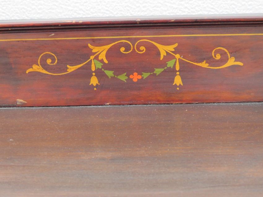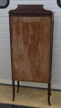 An Edwardian glazed display cabinet having door opening to reveal shelves within, hand painted with swags upon, mahogany strung with boxwood, 60 x 34 x 148cm.