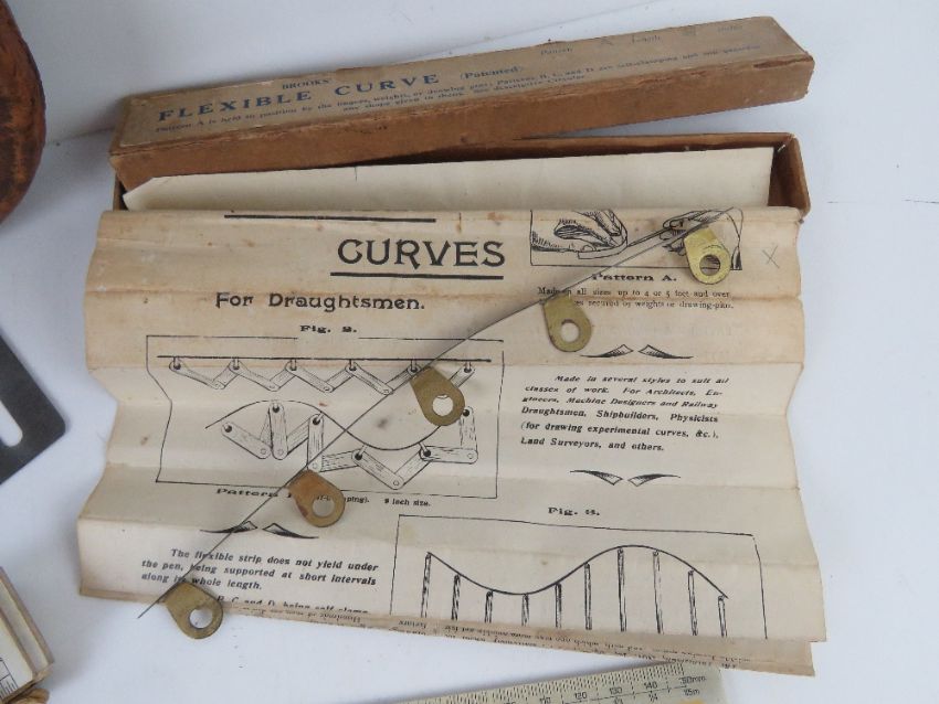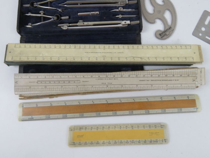 A John Rabone & Sons hundred foot tape measure together with a quantity of assorted cardboard scales, set of compasses and other assorted draftsman's items.