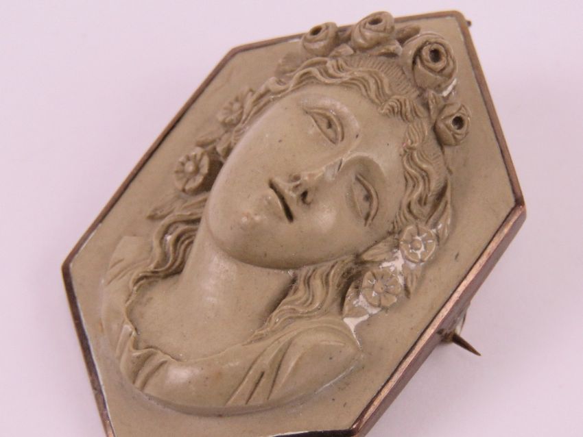 A carved lava stone cameo being a three dimensional female portrait with floral crown, no apparent hallmarks to the brooch mount, small chip to nose, 4.5 x 2.8cm.