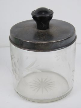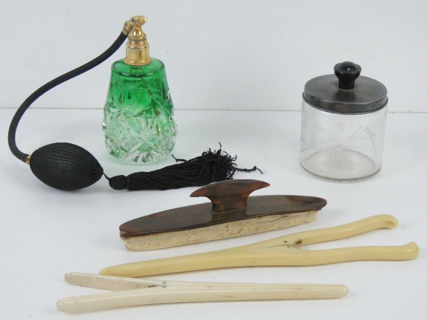 A cut glass perfume atomise together with assorted dressing table items inc foam glove stretchers, ivorex glove stretchers, nail buffer and glass pot. Five items.