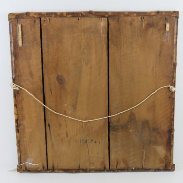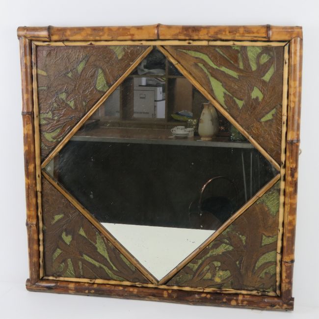 A late 19thC English Aesthetic Movement bamboo and embossed leather framed mirror, 60 x 59cm overall.