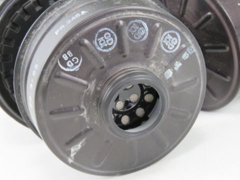A quantity of British Military gas masks filters, in bag and carry strap. Tweleve filters in total.