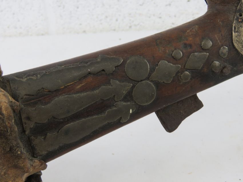 An antique Matchlock Rifle measuring over four feet in length, with a dried skin club end and a non functioning lock. No licence required.
