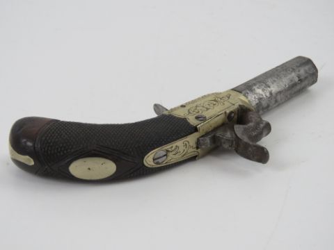 An antique .40 calibre percussion Derringer, with a concealed, flip down trigger that pops out when the hammer is at full cock. No licence required.