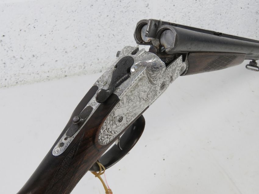 A deactivated German drilling triple barrel combination gun by Kreighoff. Having fine woodland scene engraved to action, with walnut stock, side by side 16 gauge shotgun barrels and 8mm rifled barrel underneath, moving trigger, selector, safety, opening action, and ammunition storage compartment. With EU cert.