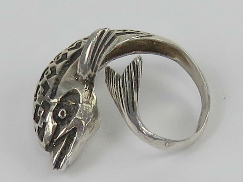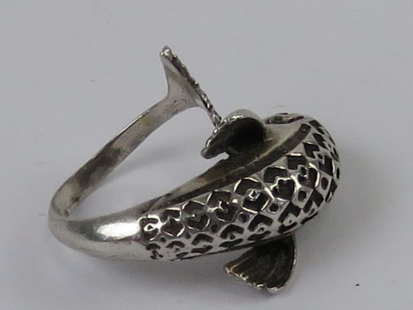 An unusual sculptural ring in the form of a dolphin, having carved detail and wrap around style, slightly adjustable size approx O, no apparent hallmarks.