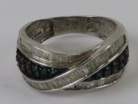 A silver cocktail ring set with blue and white stones, stamped 925, size O.