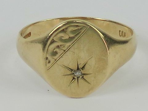 A 9ct gold and diamond signet ring, unengraved with diamond in star setting and scroll decoration upon hallmarked 375, size S-T, 2.8g.