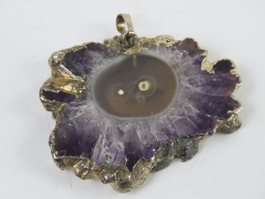 An amethyst geode slice mounted as a pendant, 5 x 3.8cm.
