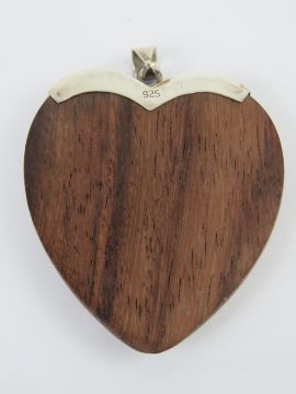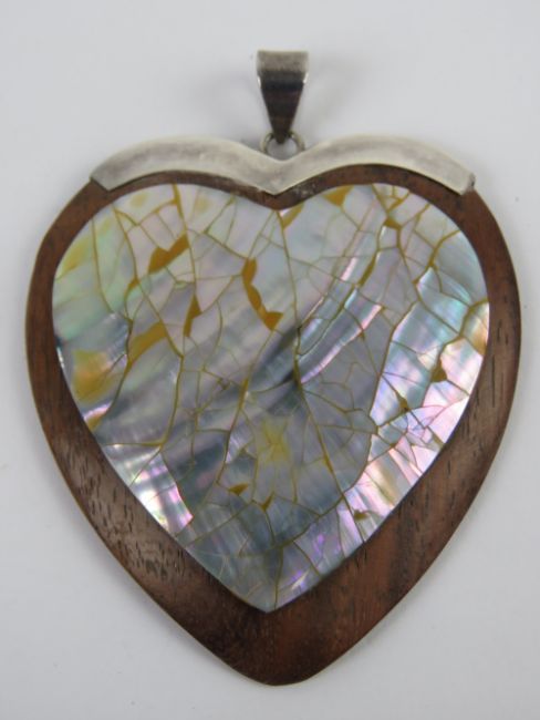 A large silver and abalone shell heart shaped pendant, 6.8cm inc bale, stamped 925.
