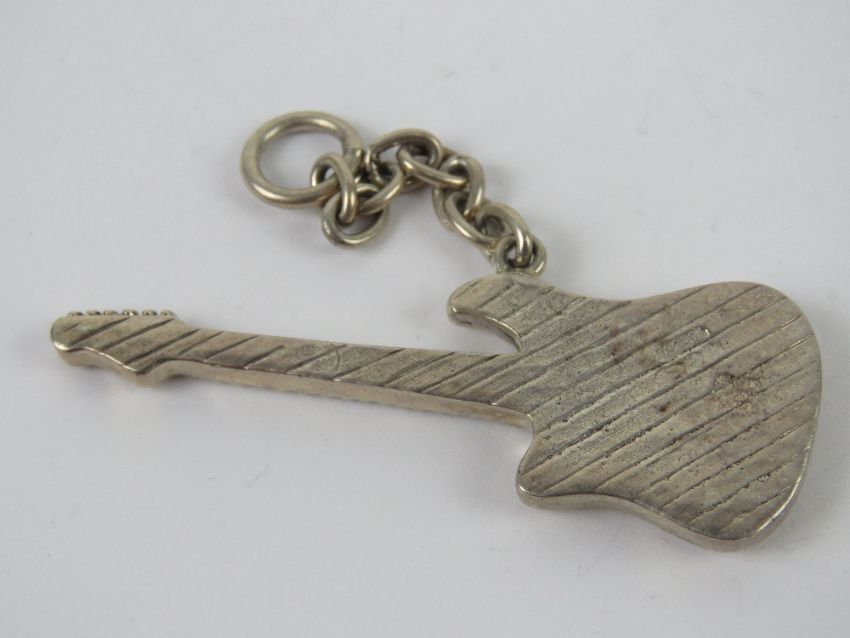 An unusual HM silver key chain in the form of an electric guitar, guitar measuring 5.7cm in length, hallmarked for Birmingham, 18.9g.