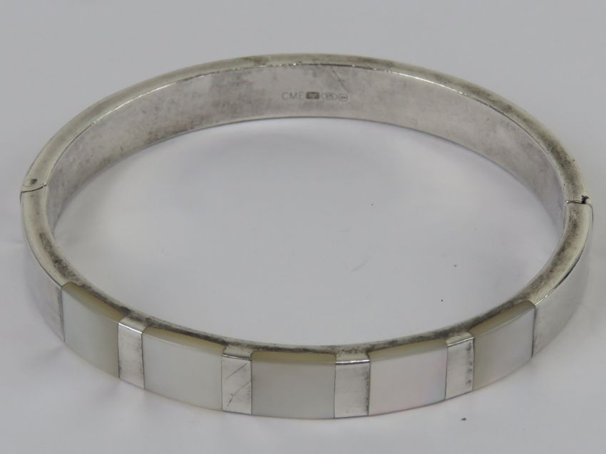 A HM silver and mother of pearl inlaid hinged bangle, hallmarked for Birmingham, 6.4 x 5.5cm internal dia, 7mm wide, 17.5g.