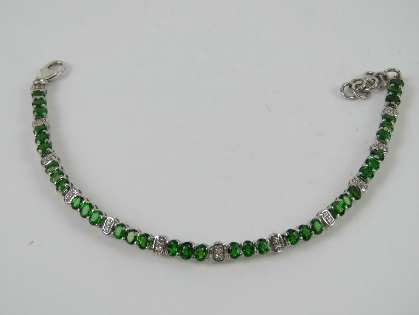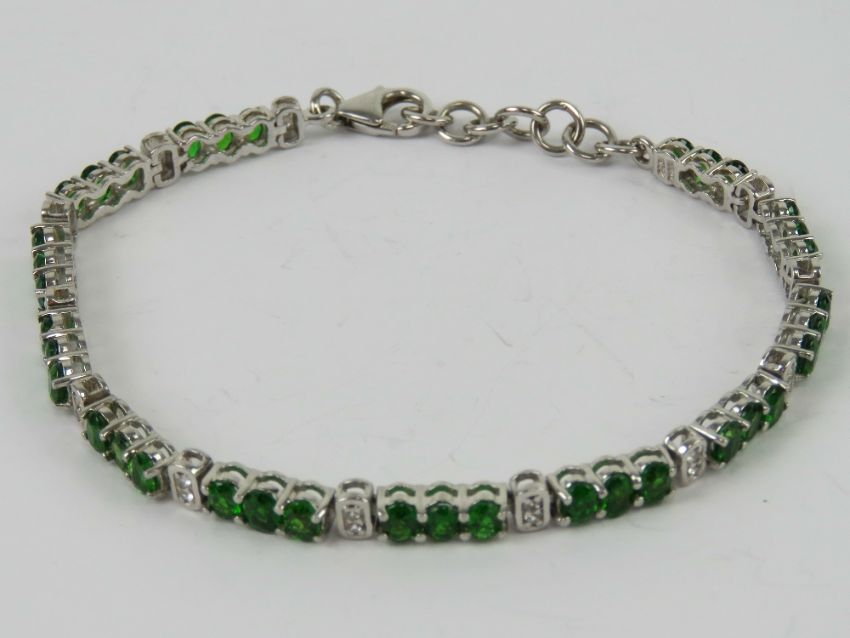A silver tennis bracelet set with green and white stones, hallmarked for Birmingham, slightly adjustable length 18.5 to 20.5cm.