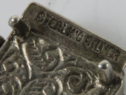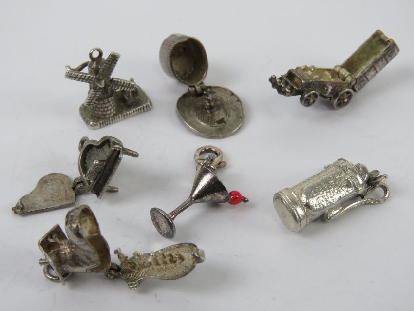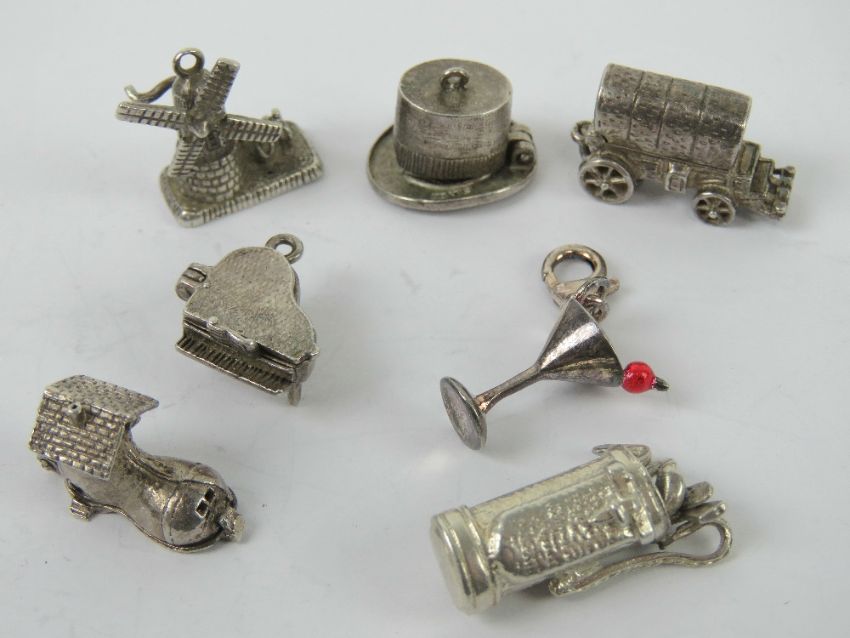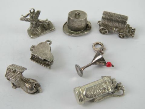 A delightful 925 silver charm in the form of a cocktail complete with cherry on stick. Together with three articulated charms each stamped silver being windmill, top hat with rabbit under, and boot with woman and children within, also a sterling silver piano charm with lift up lid, and two white metal charms in the form of a wagon with supplies inside and a golf bag complete with clubs. Seven items, 24.5g.