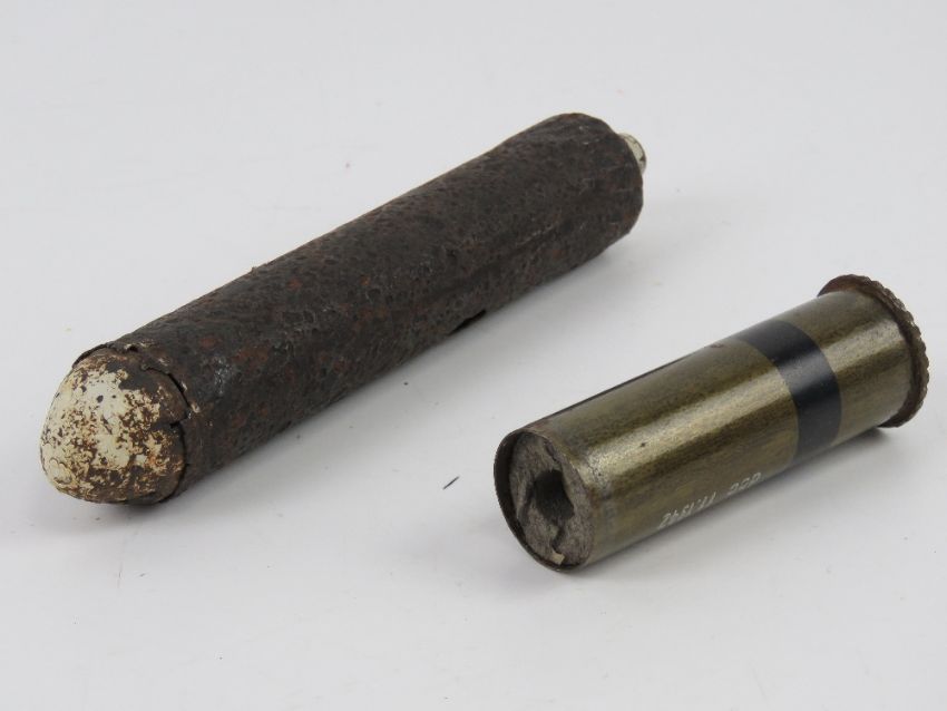 An inert WWII German K98 Propaganda-Gewehrgranate being a non-lethal rifle grenade designed to deliver propaganda leaflets. Together with a WWII German flare cartridge dated 1942.
