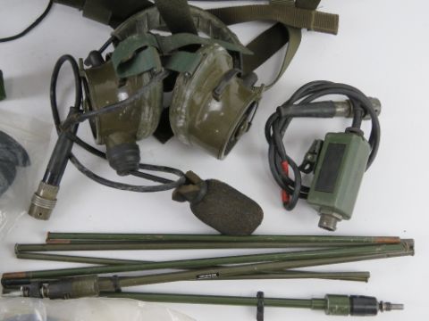 Two British Military Radio headsets having cables and switches, in British transit bags.
