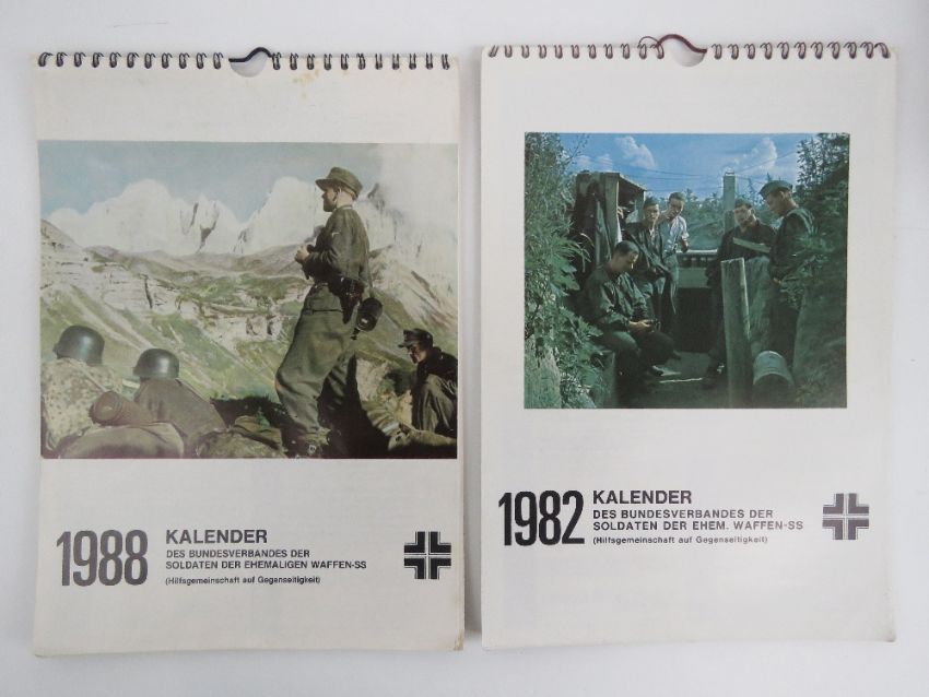 Two later Waffen SS calendars, 1982 and 1988 respectively each containing a quantity of reproduced WWII imagery within.