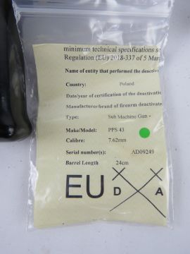 A deactivated Polish PPS-43 7.62mm sub machine gun having moving dummy metal bolt (under spring pressure), trigger, and safety. With EU cert.