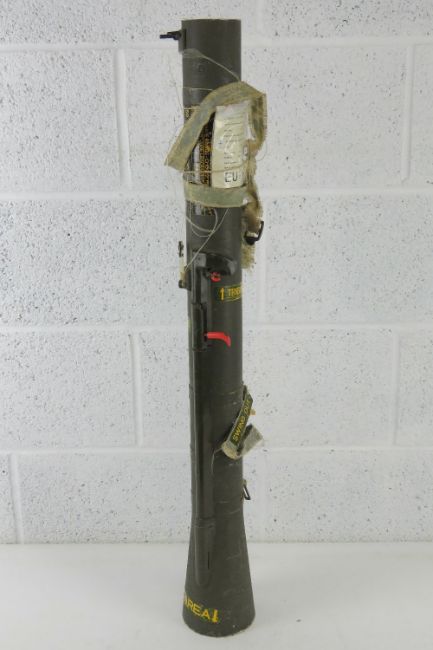 A deactivated Miniman 74mm rocket launcher, having inert rocket inside, with firing mechanism and flip up sights. With EU cert.