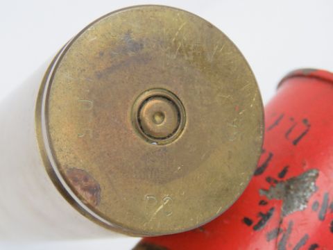 An inert British 30mm AFV shell with head, together with a Mills grenade fuse pot.