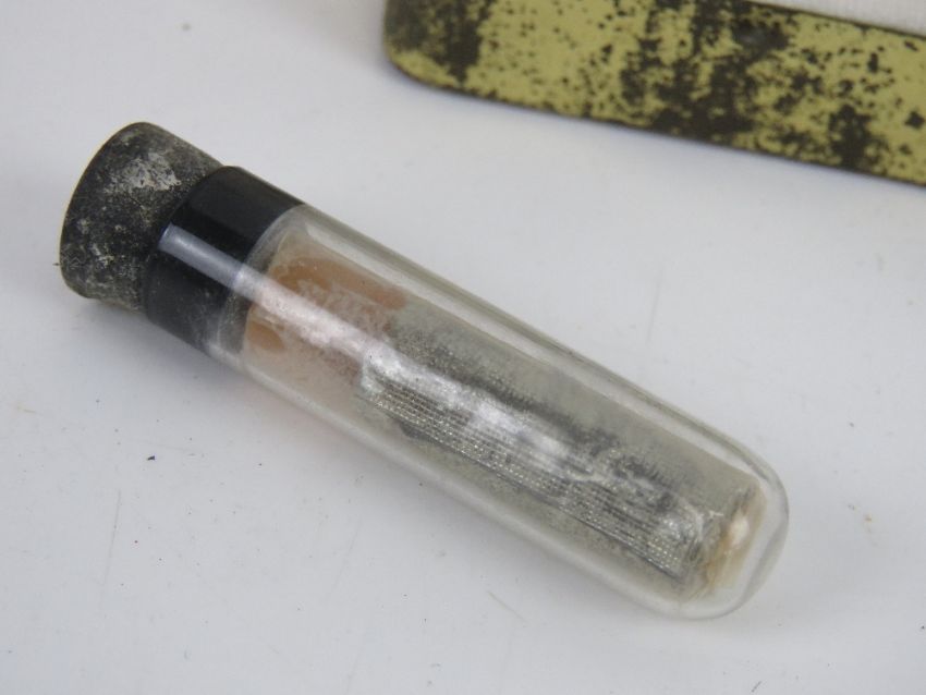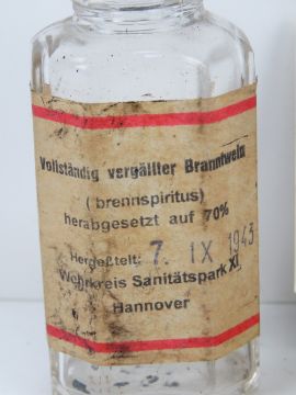 A completely denatured brandy / rectified spirit bottle (70% proof medical tincture) bearing label dated 1943, together with a medics tin and accessories.