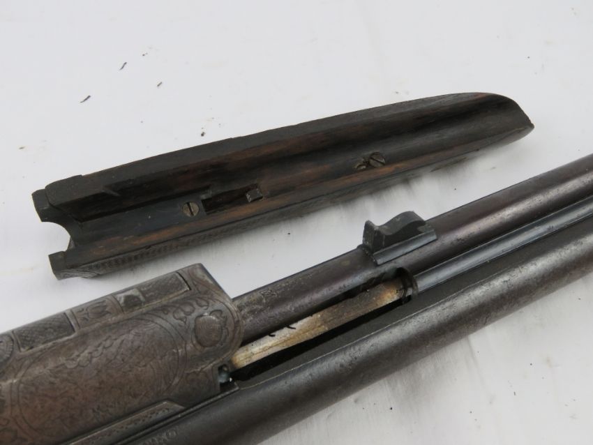 A deactivated German drilling double barrel combination hammer gun having engraved stag and fox design to action, an underlever barrel release, top mounted fire selector and bullet storage area in the stock, over and under 16 gauge barrel on top and a 8x57mm rifled barrel underneath. With EU cert.