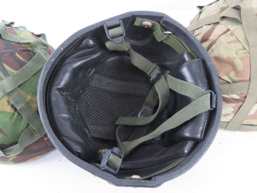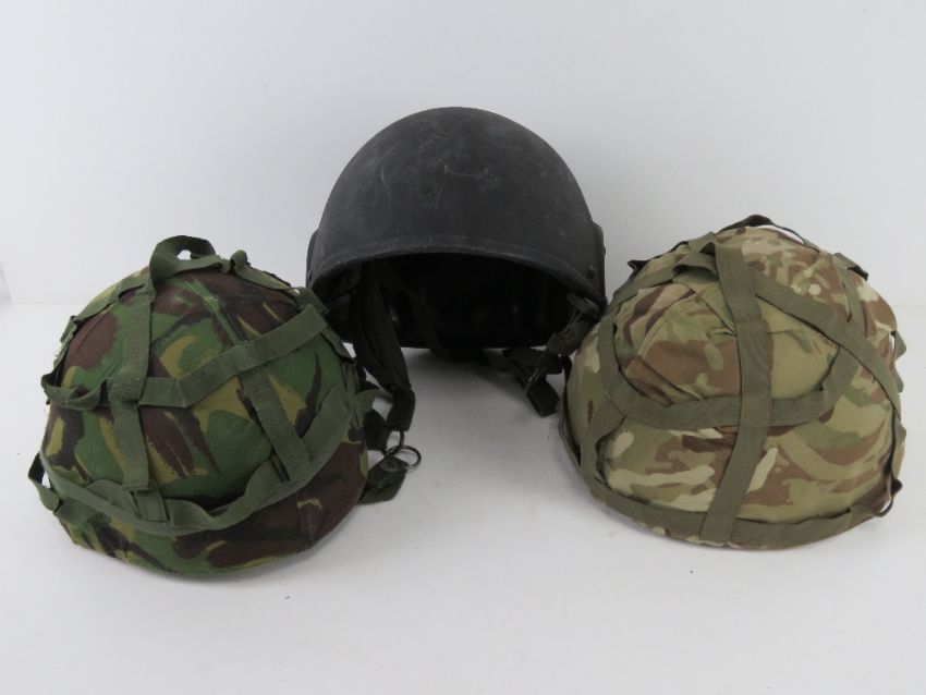 Two Mk 6 British military helmets each with liner and chin strap. Together with a Mk6a British military helmet with liner and chin strap. Three items.