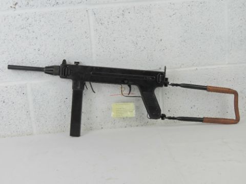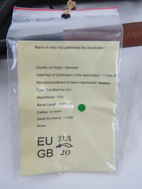 A deactivated Madsen M50 sub machine gun having moving dummy metal bolt (under spring pressure), trigger, and safety catch. With EU cert.