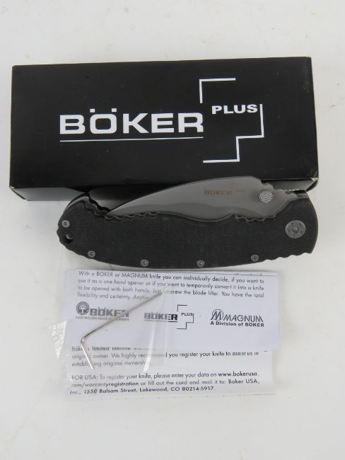 A Boker Plus pocket knife, made from 8Cr13Mov steel, in box.