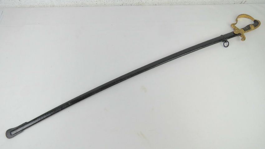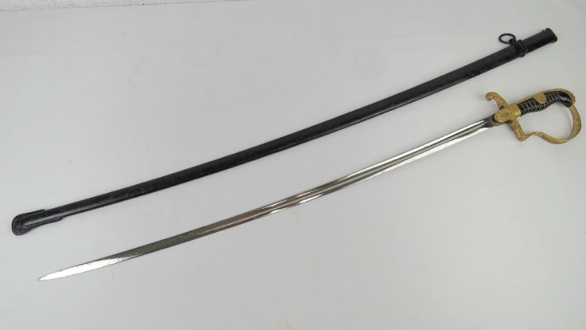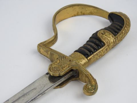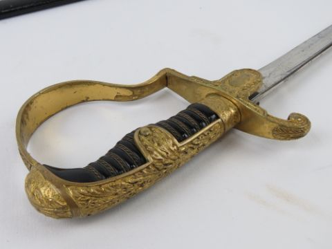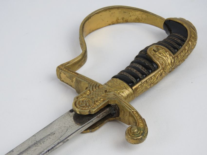 A WWII German Officer's sword with scabbard, bearing makers mark on the blade for Eikhorn Solingen, marked Ges Gesch to guard, blade measuring 76.5cm.