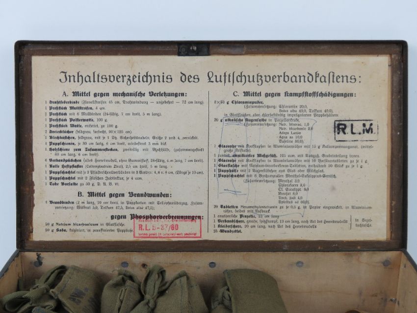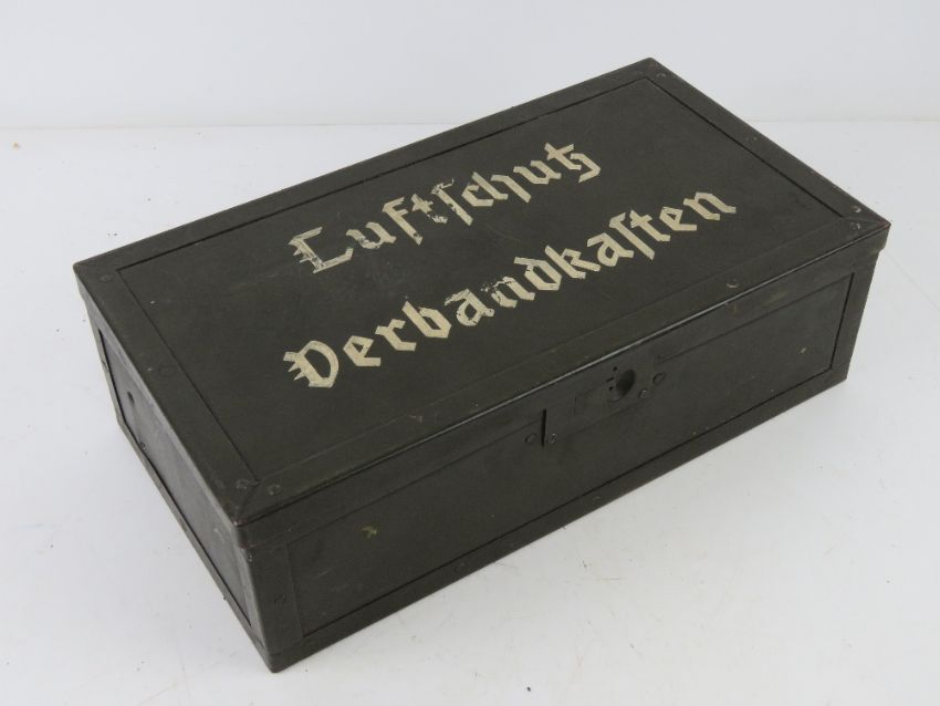 A reproduction WWII German Luftschutz First Aid box with medical accessories inc; GEW, WAFFE bandaids, foot powder, torniquet, glass bottle etc.