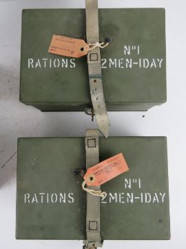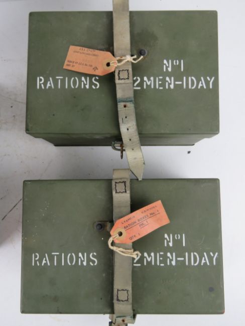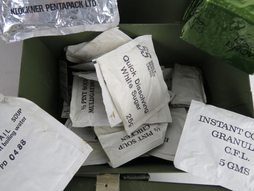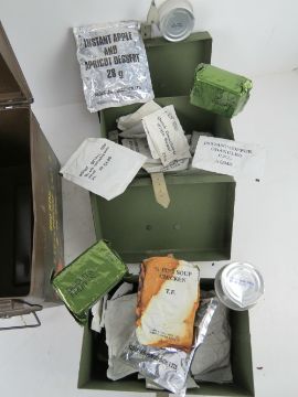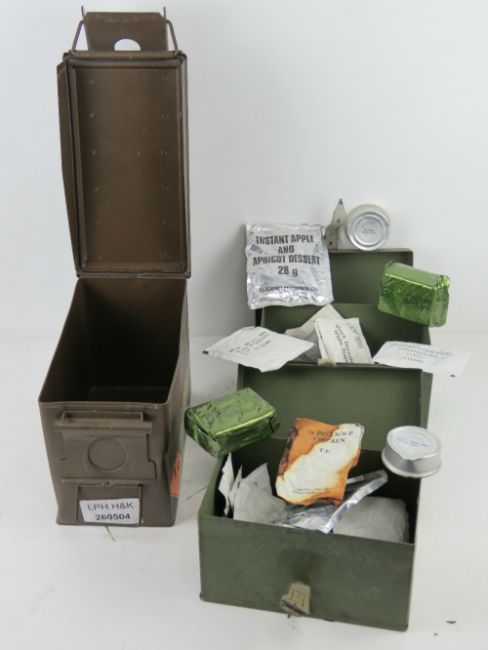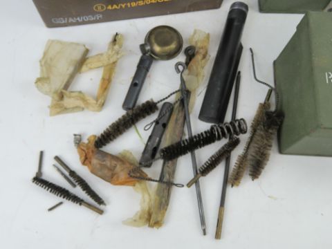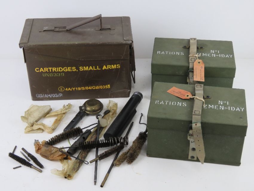 Two 1956 British Military rations tins, with contents together with a British Military 5.56 ammo tin, M4 buffer tube, MG53 cleaning brushes, cleaning kits, oil bottle and cleaning rods.