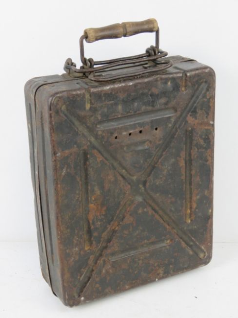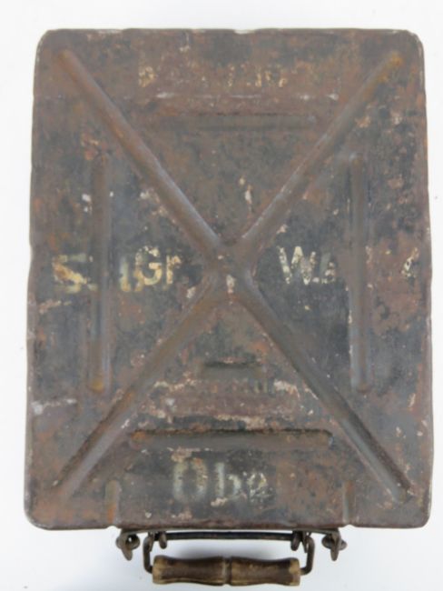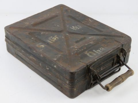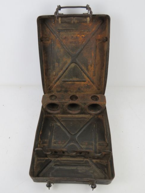 A WWII German 80mm mortar round transit case, having stencilling upon. To hold three mortars, contents deficient. Having German stamps upon and dated 1940.