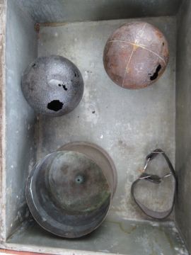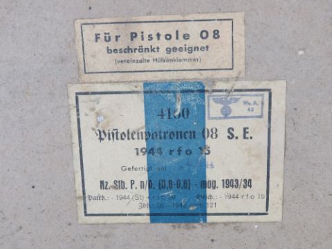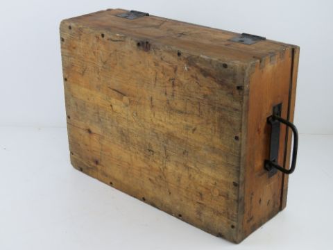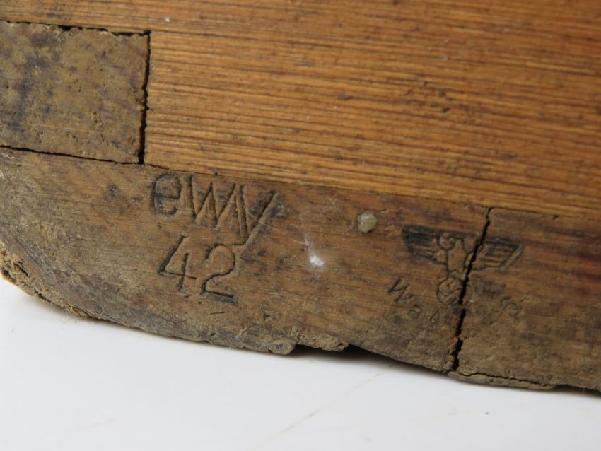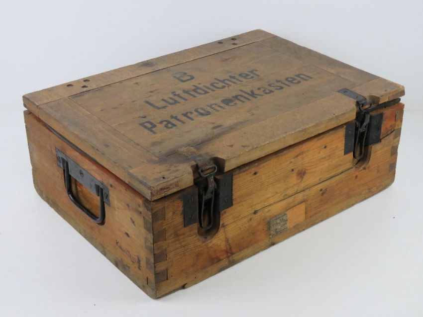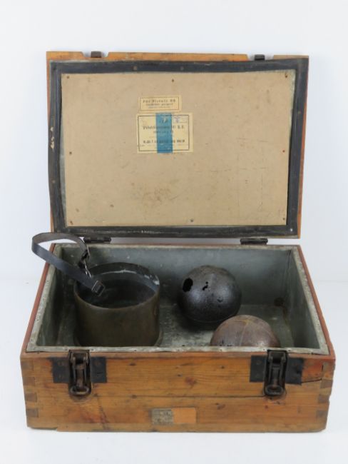 A WWII German 9MM ammunition wooden box for the P08 luger, lead lining with original labels and stencilling, dated 1942, a WWI 15cm German shell case dated 1915, a rare inert Russian Mk1 Incendiary charge and an inert MK2. Four items.