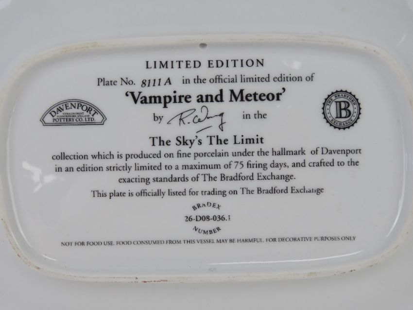 A limited edition Bradford Exchange decorative plate featuring The Vampire and Meteor Aeroplanes from The Sky's the Limit Collection. Together with two reproduction Wade decorative pin dishes featuring the Bristol Britannia and the D8 Comet. Also a glass paperweight having aviation theme. Four items.