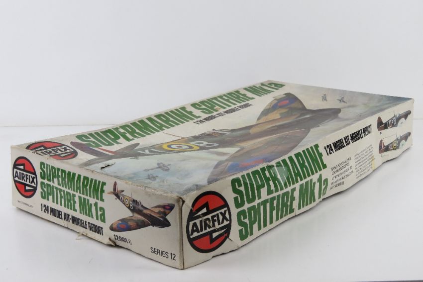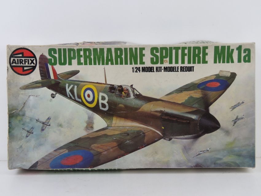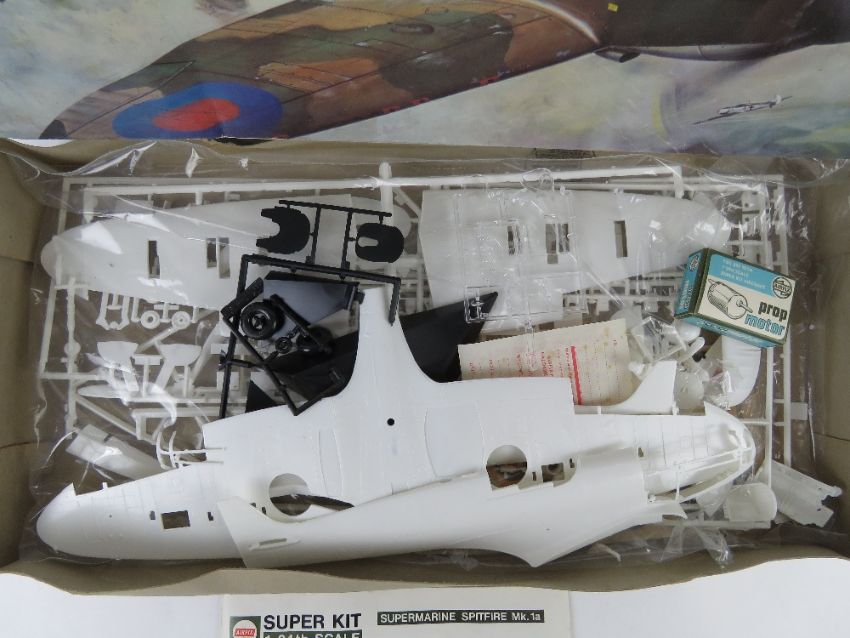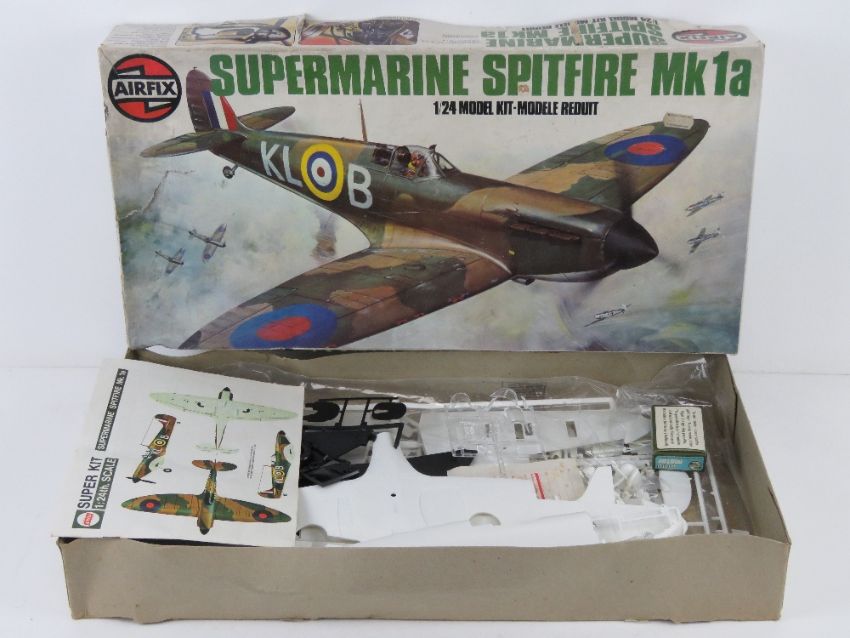 A vintage Airfix Supermarine Spitfire Mk1a, 1/24 scale model kit.