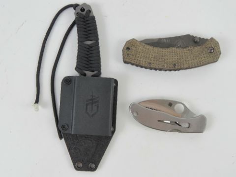 Two pocket knives being Spyderco and Fox knives. Together with a Gerber knife in sheath. Three items.