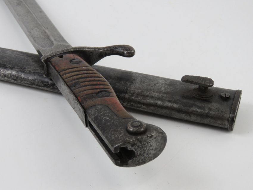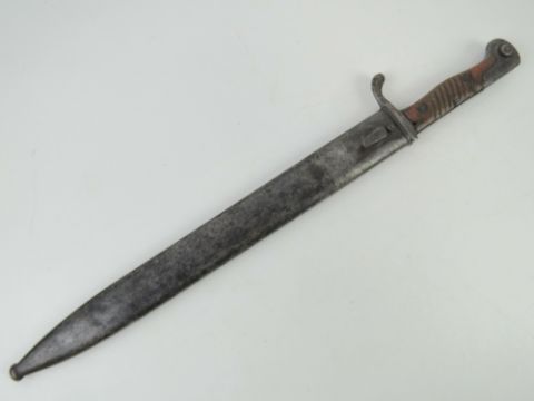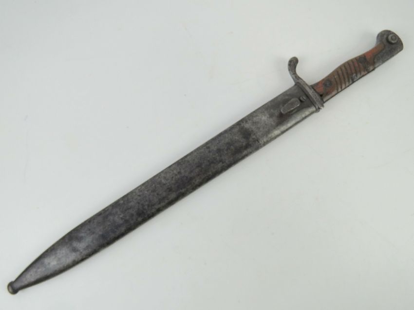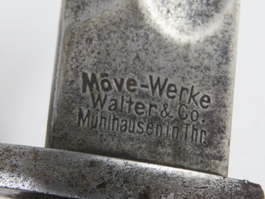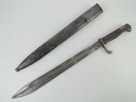 A WWI German Seitengewehr 98/05 'Butcher Blade' bayonet made by MoveWerke, Walter & Co. Muhlhausen, Thuringen. With steel scabbard.