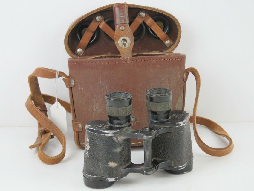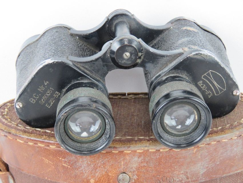 A pair of WWII German or Romanian, Carl Zeiss Binoculars, B.C. No.4, Sr 60051, E 22-53, 8x30 - 81/2", with 4 spare tactical lenses, all within original leather case. Binoculars marked with Carl Zeiss logo and code dating to WWII (1942 - 1944) period. Some service wear.