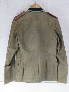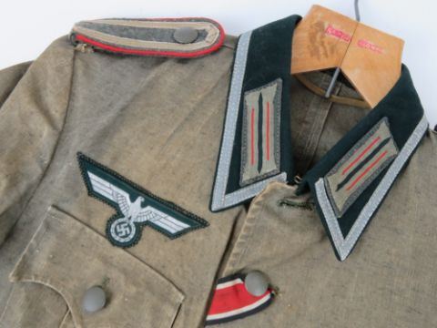 An rare WWII German Heeres Artillery or Gunnery NCO's summer tunic, Iron Cross recipient having 2nd Class ribbon. No visible size, or maker's marks. Correct markings under the tunic buttons, correct stitching, collar and shoulder insignia. Some fading and wear commensurate with age.