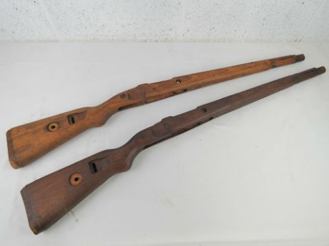 Two KAR98 wooden stocks, one has a makers mark dot and serial number 9669.