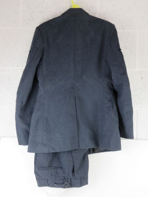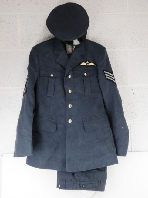 An RAF No1 Dress uniform with peaked cap, having cloth patches upon.