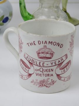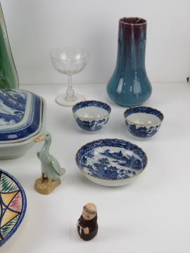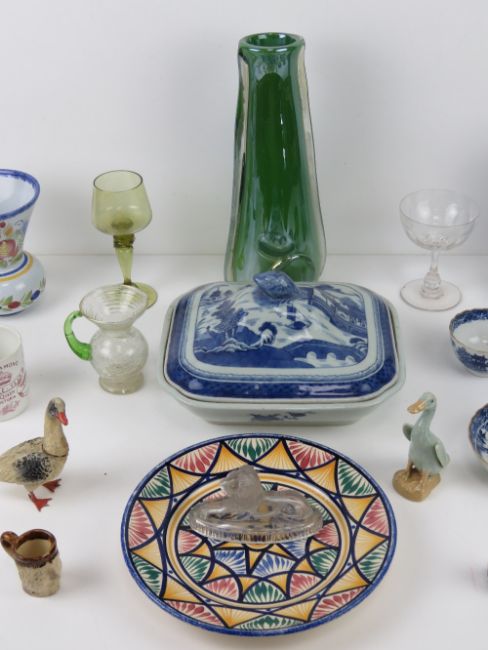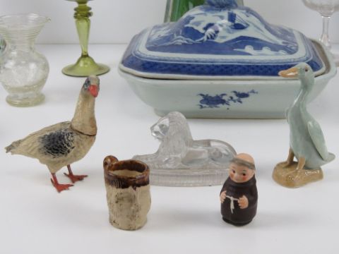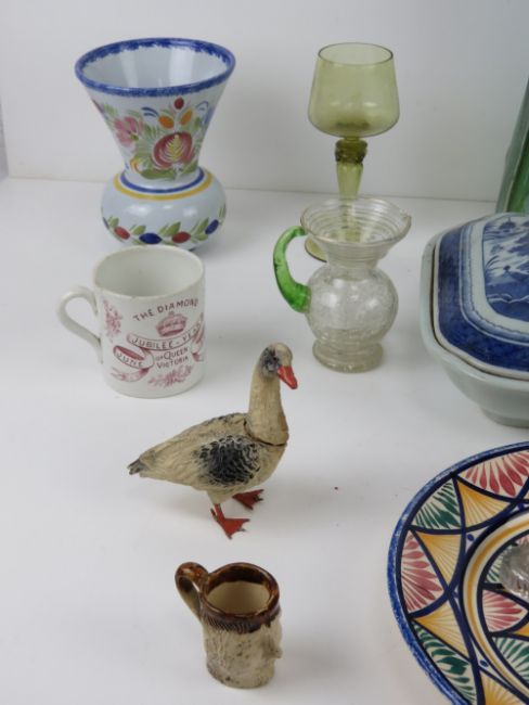 A quantity of assorted ceramics and glassware including; a commemorative Diamond Jubilee year Queen Victoria mug, a blue & white tureen, single champagne saucer, short crackle glass vase, pressed glass lion figurine, West German fryer figurine, etc.