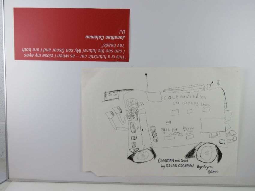 From the famous BEN (Motor and Allied Trades Benevolent Fund) auction at Brooklands Museum on February 17th 2001 where celebrities of the day were asked to create artwork depicting their dream cars. Jonathan (Jono) Coleman (Lot 15 in the BEN auction) 'This is a futuristic car - when i close my eyes i can see my future, my son Oscar and I are both revheads', two drawing one by Jono and one by his son, 60 x 43cm. Signed by Jonathan (Jono) Coleman, Radio DJ. Frames size 73 x 110cm. Prov: From the collection of a prominent member of the Guild of Motoring Writers.