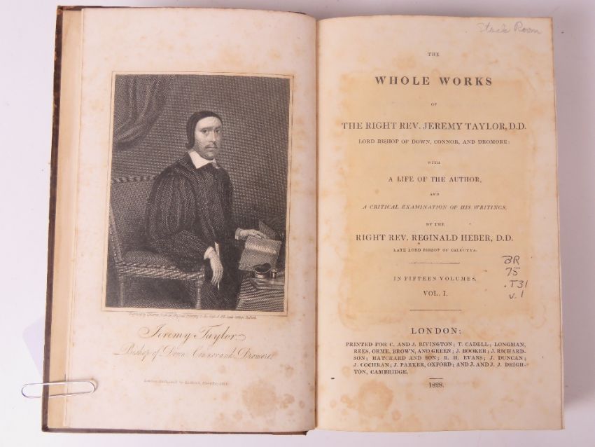 Books; Taylor's Works 'the whole works by the Right Rev Jeremy Taylor' in ten assorted volumes. Leather full bound. Published London 1828. a/f. Together with three other volumes of the same work published London 1831. Ex-Libris Cathedral and Abbey of St Alban.