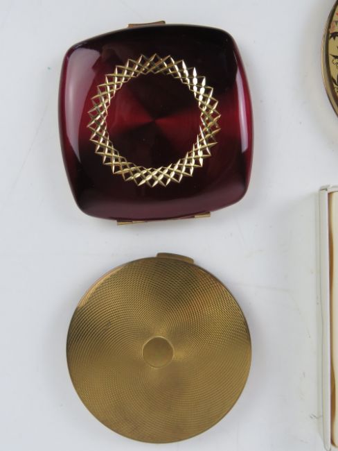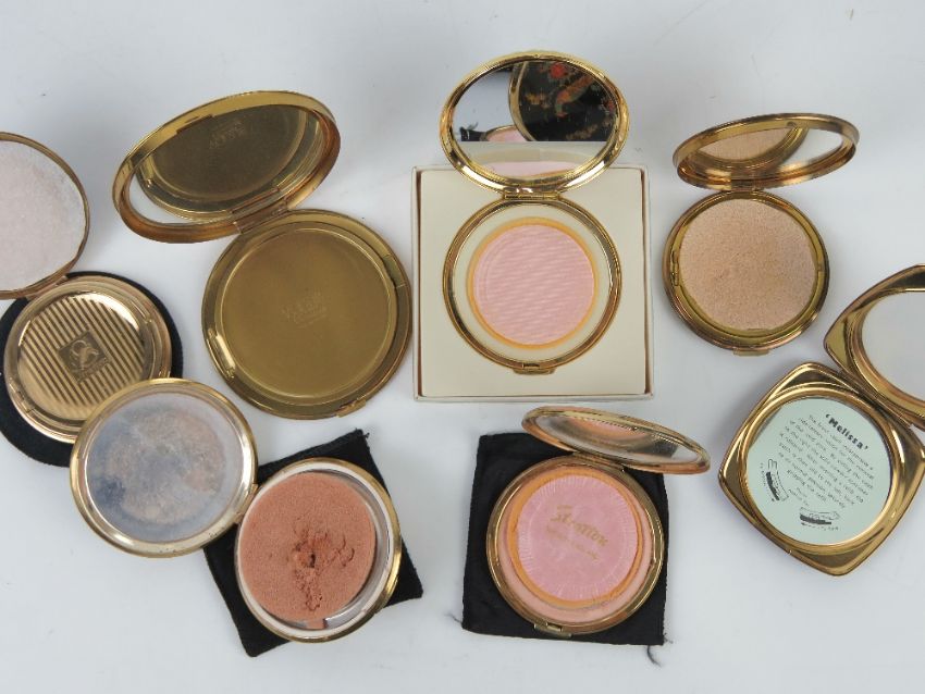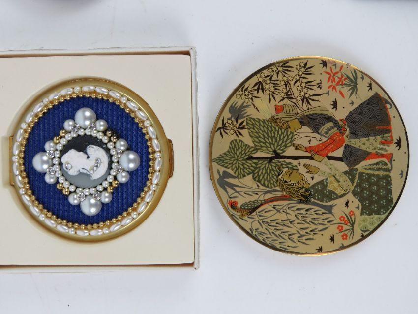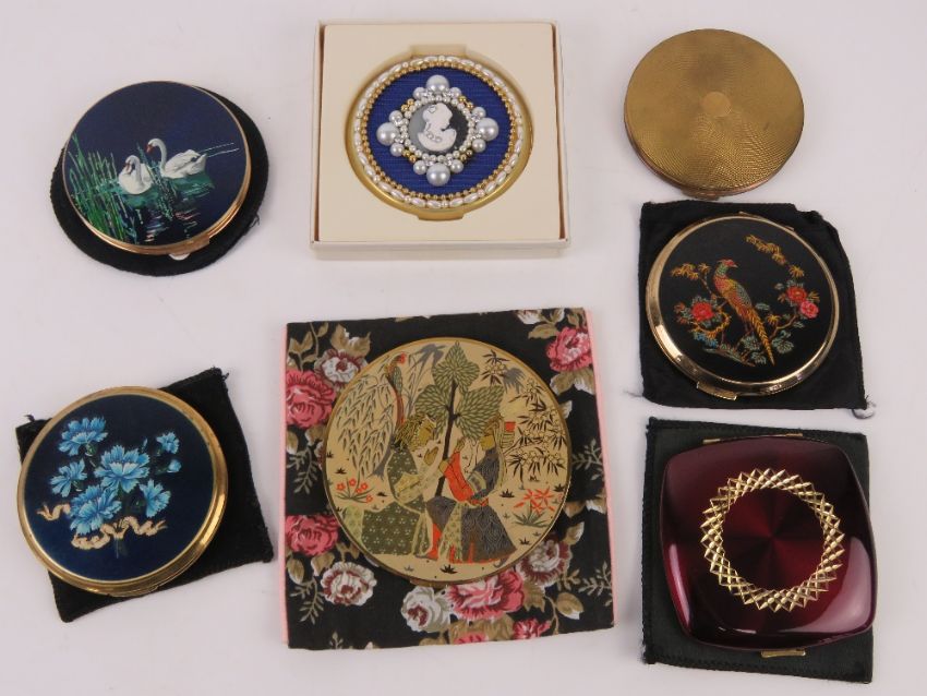 A quantity of vintage compacts including a Vogue Vanities Oriental influence compact, the 'Melissa' compact having original instructions within, three Stratton compacts, two having enamelled bird designs to front, a British made compact having floral patterned front and another. Seven items.