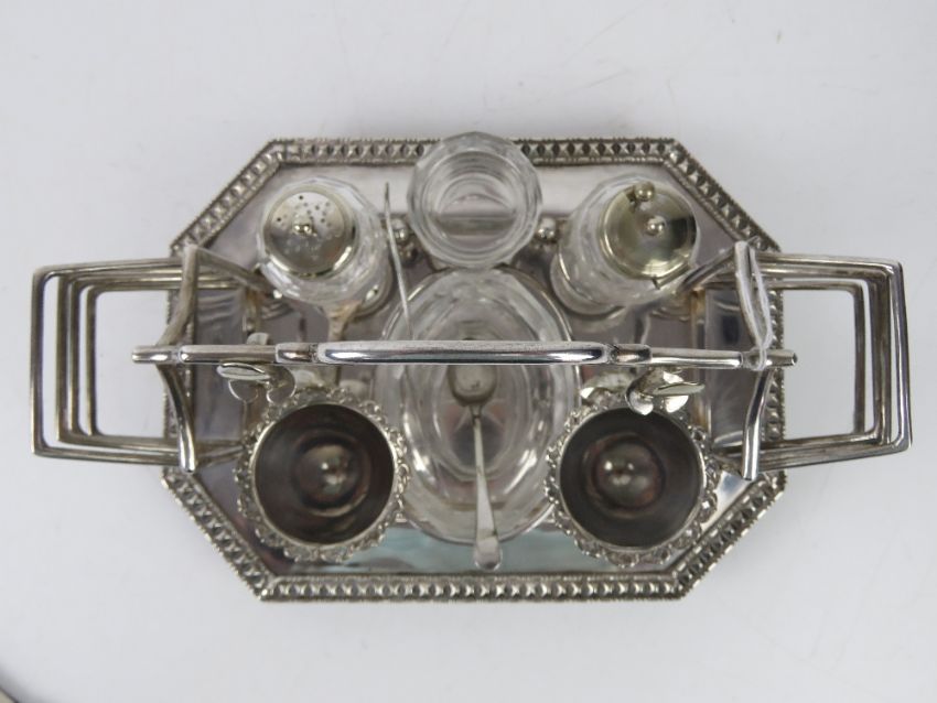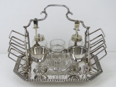 A late Victorian silver plated breakfast set comprising side toast racks, pair of egg cups with spoons and cruet.