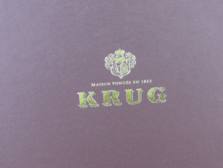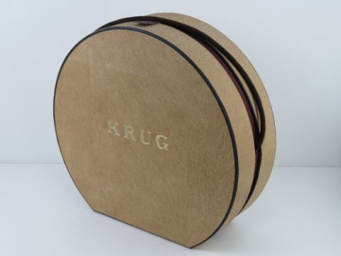 A Krug champagne gift box in the style of a hat box, contents deficient, to fit three bottles, 44cm wide.