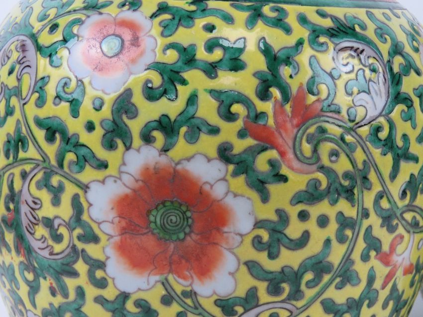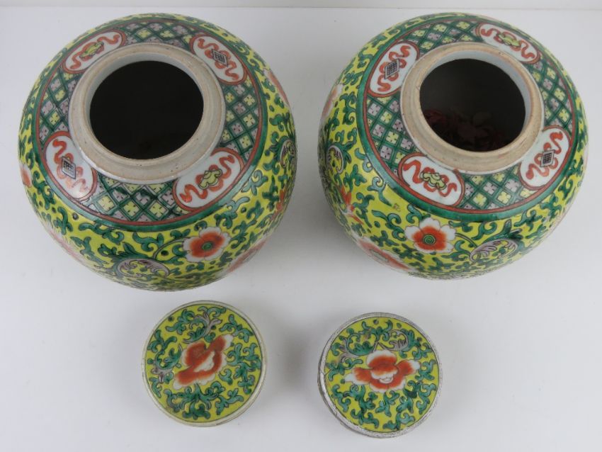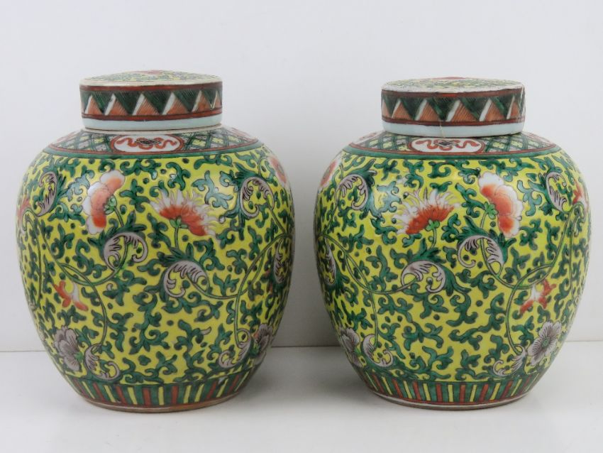 A pair of Oriental lidded ginger jars in yellow ground with green and orange floral decoration upon, one lid a/f, each standing 24cm high.