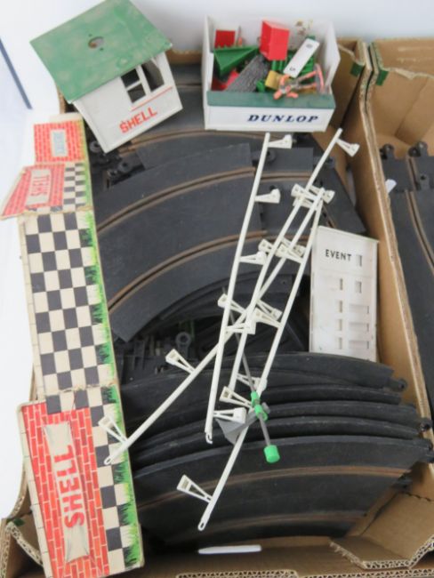 A quantity of vintage Triang Scalextric track and trackside ephemera.